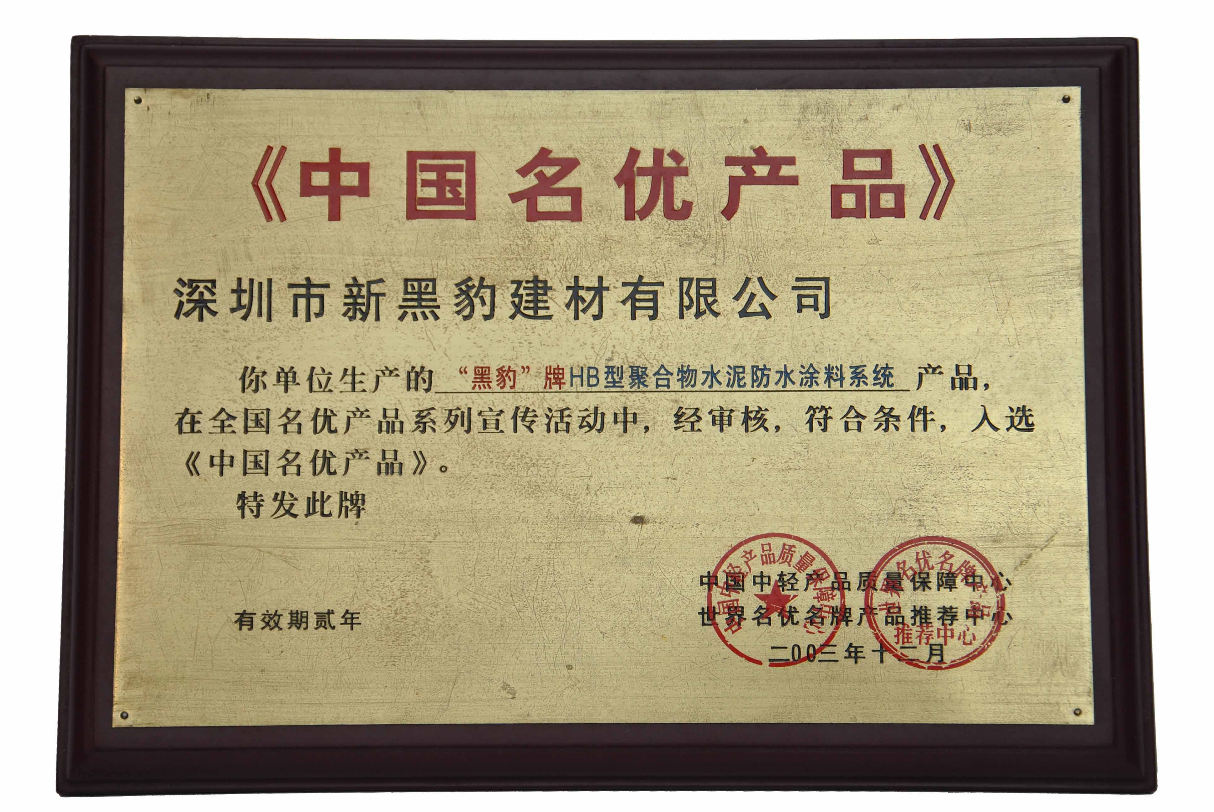 2003年12月,深圳市新黑豹建材有限公司獲得由中國中輕產(chǎn)品質(zhì)量保障中心和世界名優(yōu)名牌產(chǎn)品中心共同頒發(fā)的《中國名優(yōu)產(chǎn)品》榮譽稱號。