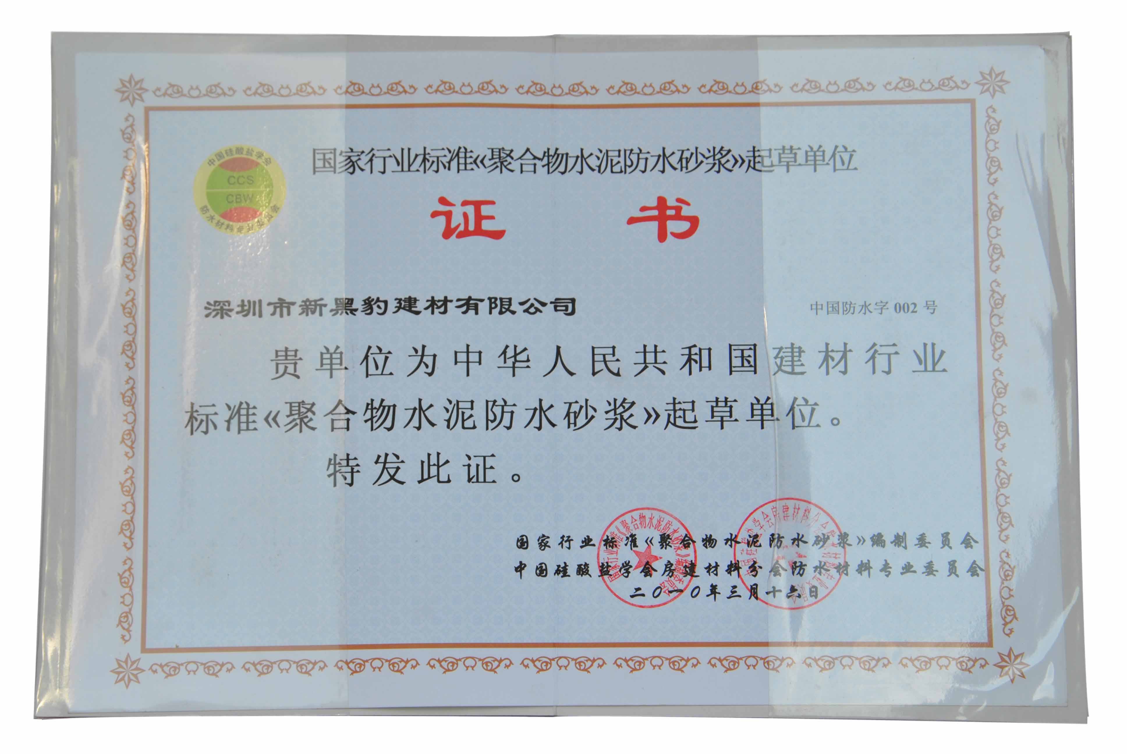 2010年,深圳市新黑豹建材有限公司為中華人民共和國國際標(biāo)準(zhǔn)《聚合物水泥防水砂漿》起草單位之一,國家行業(yè)標(biāo)準(zhǔn)《聚合物水泥防水砂漿》編制委員會特發(fā)此證。