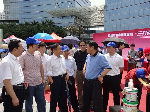 2012年4月29日上午在福田區(qū)的新城市廣場,由深圳市住房和建設(shè)局主辦“三打兩建”現(xiàn)場宣傳活動(dòng),市住房和建設(shè)局領(lǐng)導(dǎo)、市場監(jiān)督管理局局長親臨現(xiàn)場、市工程質(zhì)量監(jiān)督總站、市建筑業(yè)協(xié)會(huì)、市防水協(xié)會(huì)領(lǐng)導(dǎo)高度重視,現(xiàn)場接受咨詢,此次活動(dòng)得到了各企業(yè)、新聞媒體及廣大市民的積極響應(yīng)。展示現(xiàn)場備受局領(lǐng)導(dǎo)和市民關(guān)注的有:“黑豹”牌聚合物水泥防水涂料(真、假品);防水卷材、結(jié)晶型防水材料(真、假品),還有燃器(具)、鋼筋、水泥、消防器材、安全設(shè)施及防護(hù)器具等。