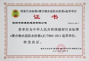 我公司為中華人民共和國建材行業(yè)標準《聚合物水泥防水漿料》JC/T984-2011起草單位.并獲得了國家行業(yè)標準《聚合物水泥防水漿料》編制委員會頒發(fā)證書。國建材行業(yè)標準《聚合物水泥防水砂料》JC/T984-2011已于2012年7月1日實施。