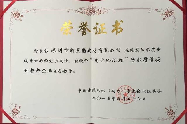 2015年6月27日,“第四屆建筑防水(南方)專家論壇”在深圳市五洲賓館召開(kāi)。本次論壇由中國(guó)建筑防水協(xié)會(huì)、中國(guó)建筑防水專家委員會(huì)主辦。在本次會(huì)議中,我公司被授予“南方論壇杯”防水質(zhì)量提升標(biāo)桿企業(yè)。