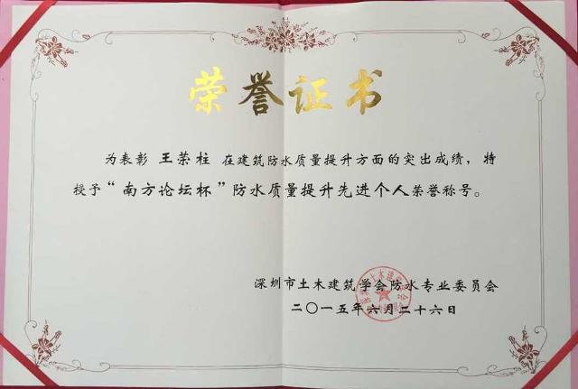 2015年6月27日,“第四屆建筑防水(南方)專家論壇”在深圳市五洲賓館召開。本次論壇由中國建筑防水協(xié)會、中國建筑防水專家委員會主辦,由深圳市土木建筑學(xué)會防水專業(yè)委員會、深圳建筑防水專家委員會承辦。在本次會議中,我公司董事長王榮柱被授予“南方論壇杯”防水質(zhì)量提升先進(jìn)個(gè)人稱號。