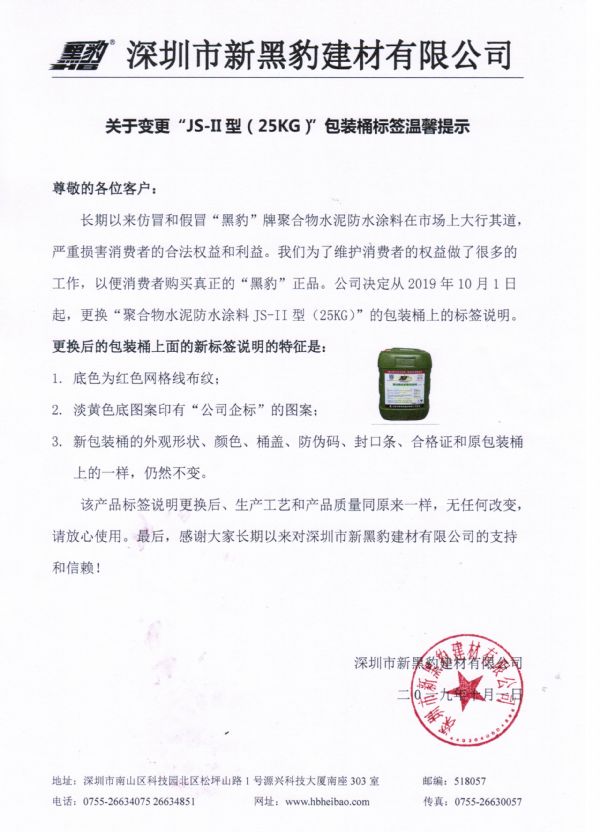 | 尊敬的各位客戶: 長期以來假冒和仿冒“黑豹”牌聚合物水泥防水涂料在市場上大行其道,嚴(yán)重?fù)p害消費者的合法權(quán)益和利益。我們?yōu)榱司S護(hù)消費者的權(quán)益做了很多的工作,以便消費者購買真正的“黑豹”正品。公司決定從2019年10月1日起,更換“聚合物水泥防水涂料JS-II型(25KG)”的包裝桶上的標(biāo)簽說明。 更換后的包裝桶上面的新標(biāo)簽說明的特征是: 1.底色為紅色網(wǎng)格線布紋; 2.淡黃色底圖案印有“公司企標(biāo)”的圖案; 3.新包裝桶的外觀形狀、顏色、桶蓋、防偽碼、封口條、合格證和原包裝桶上的一樣,仍然不變。 該產(chǎn)品標(biāo)簽說明更換后、生產(chǎn)工藝和產(chǎn)品質(zhì)量同原來一樣,無任何改變。請放心使用。最后,感謝大家長期以來對深圳市新黑豹建材有限公司的支持和信賴!